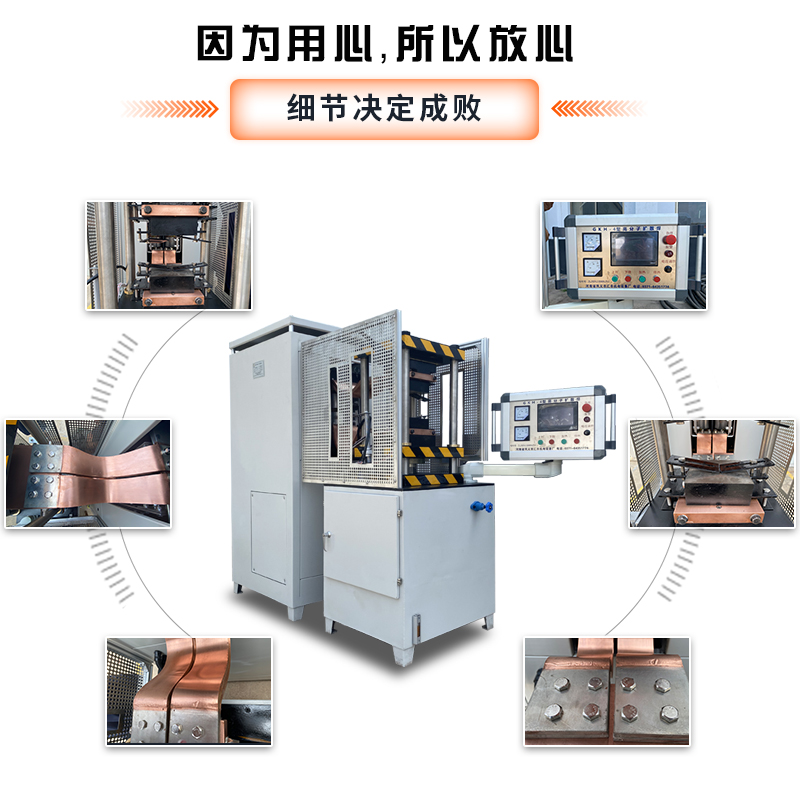 GKH-4 大優點是可以焊接各種不同材料的混合焊接、鎳包鋁軟連接。鎳包鋁板,解決了在新能源上的技術空白。在焊接軟連接時效率非常高,適用量產及大規模批量生產不同型號軟連接的同時生產。此設備有兩種操作模式,采用工業 3.0 自動化控制原理,在觸摸屏上可以轉換手動/自動模式。可在觸摸屏上設定溫度、壓力、時間及查看焊接工藝曲線,輸入所需要的焊接工藝即可自動整理出合理的控溫參數,在焊接的同時通過對工件的監控數據與自身設定的參數進行數據分析對比,自動控制焊接。同時可在外部電壓不穩定時調節自身容量來滿足焊接電壓等級的要求,針對不同的工件要求,可保存上萬種工藝及工件參數,輸入調用參數后,開始自動化焊接,采用自動化焊接使焊接控制性能更加穩定。使生產出的產品更加可靠穩定,功效更加明顯。簡單易操作,節能、效率高。降低了對工人技術水平的要求及節約能源損耗。同時可以外接機械手與設備構成全自動化生產線。